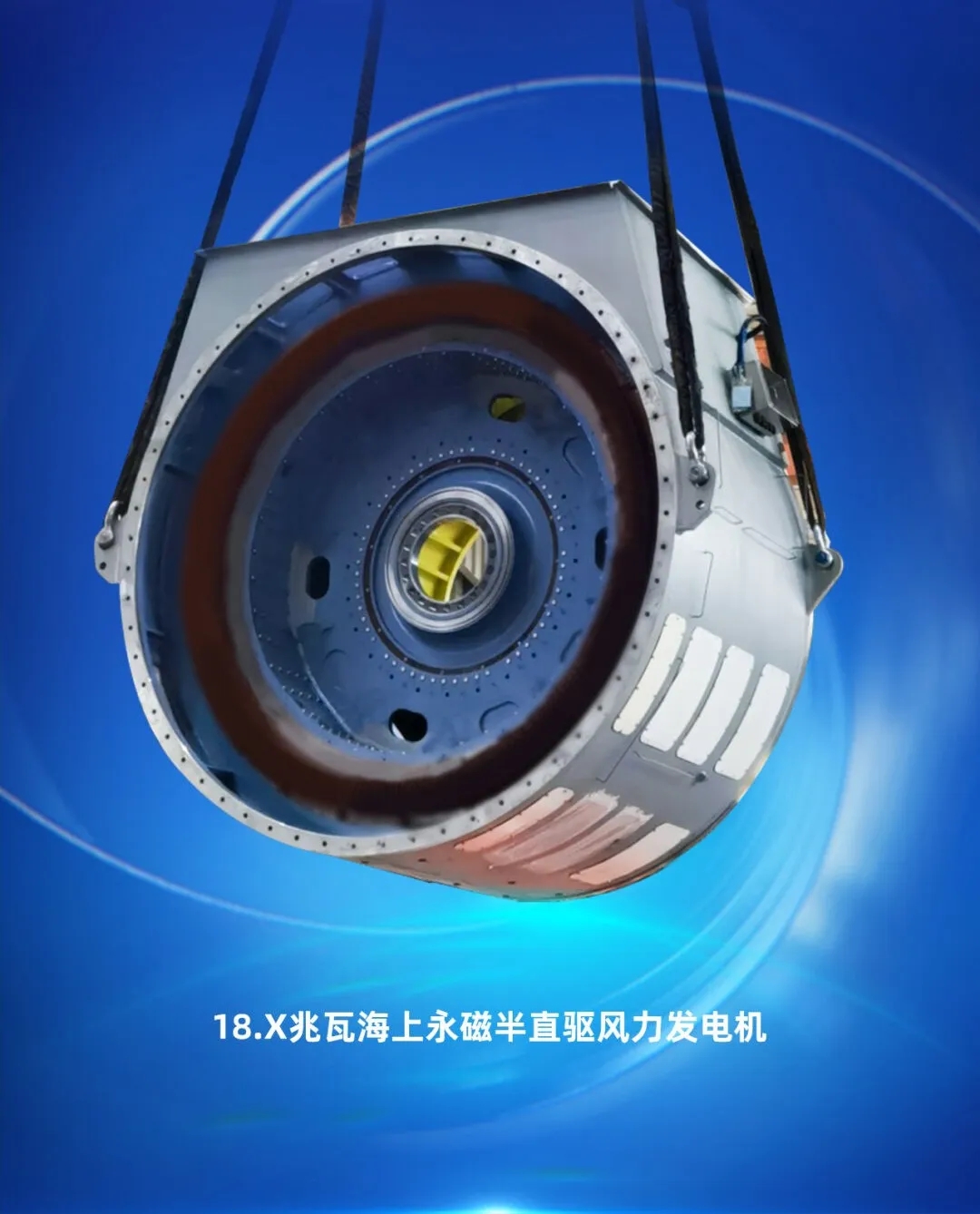 拥有完全自主知识产权的全新一代18兆瓦海上直驱风电机组,关键部件叶片、发电机、变流器、变压器等完全实现了国产化,推动了整个风电产业链的协同发展和技术进步,该机组获评2023年度央企十大国之重器。