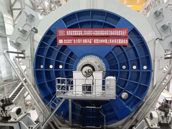 该试验平台是我国首套具有自主知识产权、拥有国际领先水平的风电机组地面试验平台,填补了我国在大型海上风电机组地面试验系统及并网试验等方面的关键技术空白。平台核心驱动设备拖动电机由东方电机联合中国电力科学研究院研发,具有低转速、重载荷、大扭矩等特点。该拖动电机高约25米、宽约13.5米、重1200多吨,额定扭矩35兆牛·米,是国内最大扭矩电动机,加载扭矩能力处于国际领先水平。额定转速7转每分钟,成功解决了低频运行转矩稳定性、时间、空间谐波引起的电磁噪声及振动响应、大直径定转子翻身起吊等行业难题。