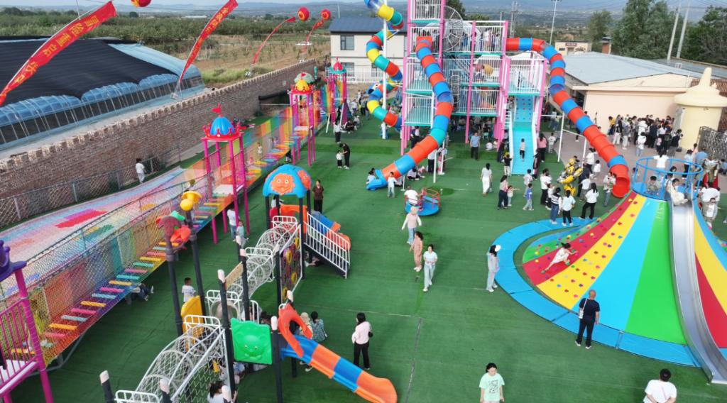 2021年,东方锅炉聚焦上东村“城郊型乡村”独特优势,精准擘画出“一轴三区九组团”的农文旅融合发展蓝图:以乡村振兴为轴心,打造亲子体验、乐耕田园、上东乡愁三大特色片区,布局儿童游乐、农业采摘、休闲观光等九大核心项目,为上东村量身定制可持续发展路径。锚定目标真抓实干,上东蓝图照进现实。东方锅炉陆续投入帮扶资金,支持上东村建成吉县首个户外大型儿童乐园,彩虹滑道、蹦蹦云等设施成为县域“网红打卡地”。以儿童乐园为引擎,星空露营基地、生态采摘园、萌宠互动区等业态相继落地,逐步形成“吃、住、游、购、娱”全链条产业矩阵。上东村实现了华丽蜕变,2022年,入选市级乡村振兴示范村;2023年,获评省级特色产业帮扶基地;村集体收入连续四年突破百万元,真正实现“小乐园撬动大产业”。