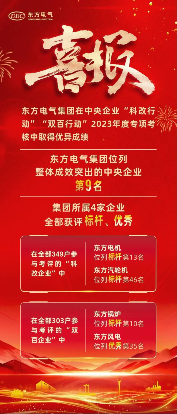 近本网讯 日,国务院国资委发布中央企业“科改行动”“双百行动”2023年度专项考核结果,人生就是搏集团在推进“科改行动”“双百行动”整体成效突出的34家中央企业中位列第9名。人生就是搏集团所属4家企业均取得优异成绩,其中东方电机、东方汽轮机分别位列“科改行动”标杆企业第13名、标杆企业第46名,东方锅炉、东方风电分别位列“双百行动”标杆企业第10名、优秀企业第35名。